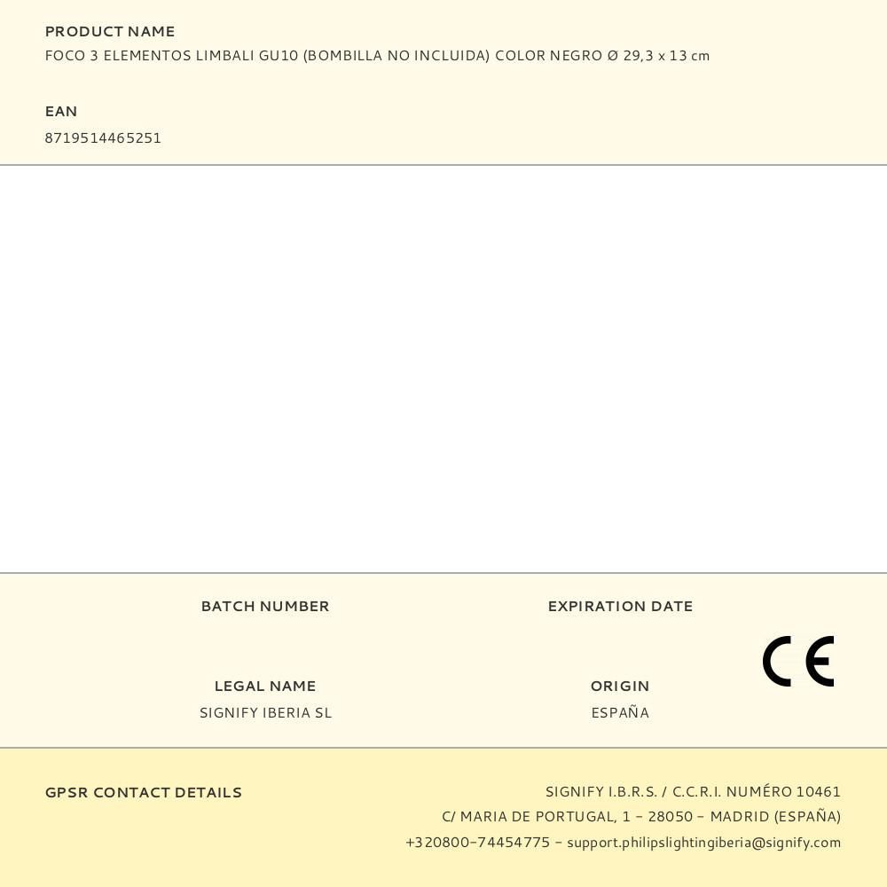 Lámpara 3 Focos, Limbali, Gu10, Bombillas No Incluidas, Ip20, 220 - 240 V ~ 50 / 60 Hz. Cabezal De Foco Ajustable, Material: Metal, Color: Negro. Dimensiones Ø29,3 X 13 Cm