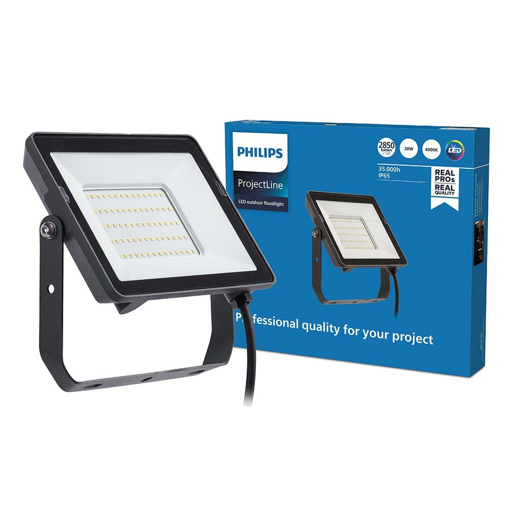 Foco Proyector Led, Color Negro, Modelo Projectline, 30 W, 2820 - 3000 Lm, Tipo De Flujo Luminoso 120°, Eficacia Lumínica 95 Lm/W, Luz Día 4000 K, Grado De Protección Ip65, Tensión 220 - 240 V ~50/60 Hz, Vida Estimada 35.000 H, Asa De Fijación Basculante. Dimensiones 190 X 27 X 156 Mm