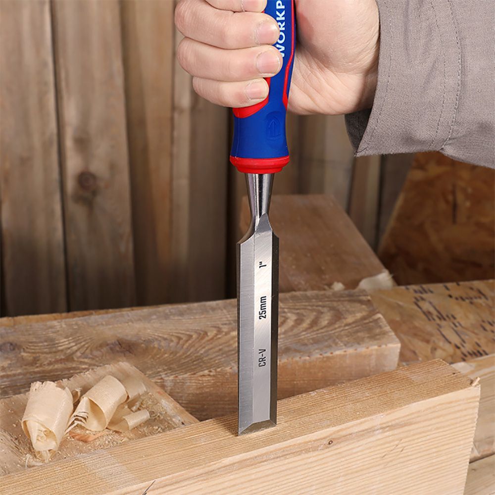 Formón, Juego De 3 Piezas, Para Madera. 12 X 267 Mm, 20 X 267 Mm, 25 X 267 Mm. Hoja De Acero Al Cromo-Vanadio Forjada, Tratada Térmicamente. Borde De Hoja 30 % Más Largo Y Afilado. Culata De Acero Diseñada Para Golpes Fuertes Con Un Martillo O Mazo. Mango Ergonómico De Alta Resistencia. Color Rojo Y Azul