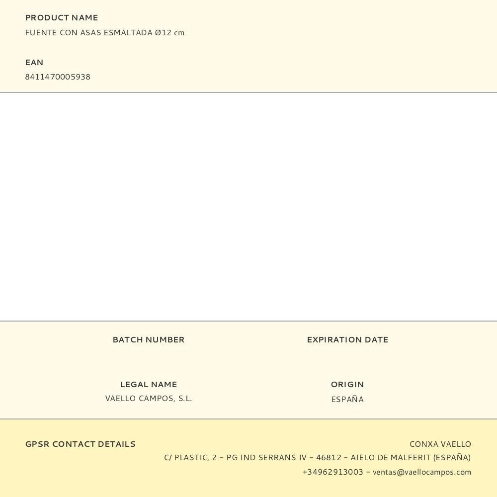 Fuente Con Asas Esmaltada Ø12Cm Vaello. Apta Para Fuego De Llama, Lavavajillas, Horno Y No Apta Para Microondas. Presentaciones Originales.