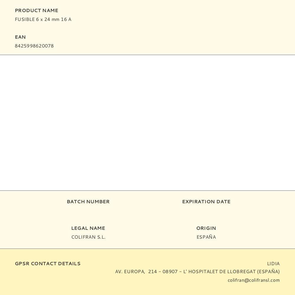 Intensidad , 16 A , Tensi u00f3n , 250 V , Medida , 6 x 24 mm , Tipo , Fusible , Color , Blanco Cristal , Material , Cer u00e1mica o cristal segun disponibilidad , Modelo , Con indicador de fusi u00f3n