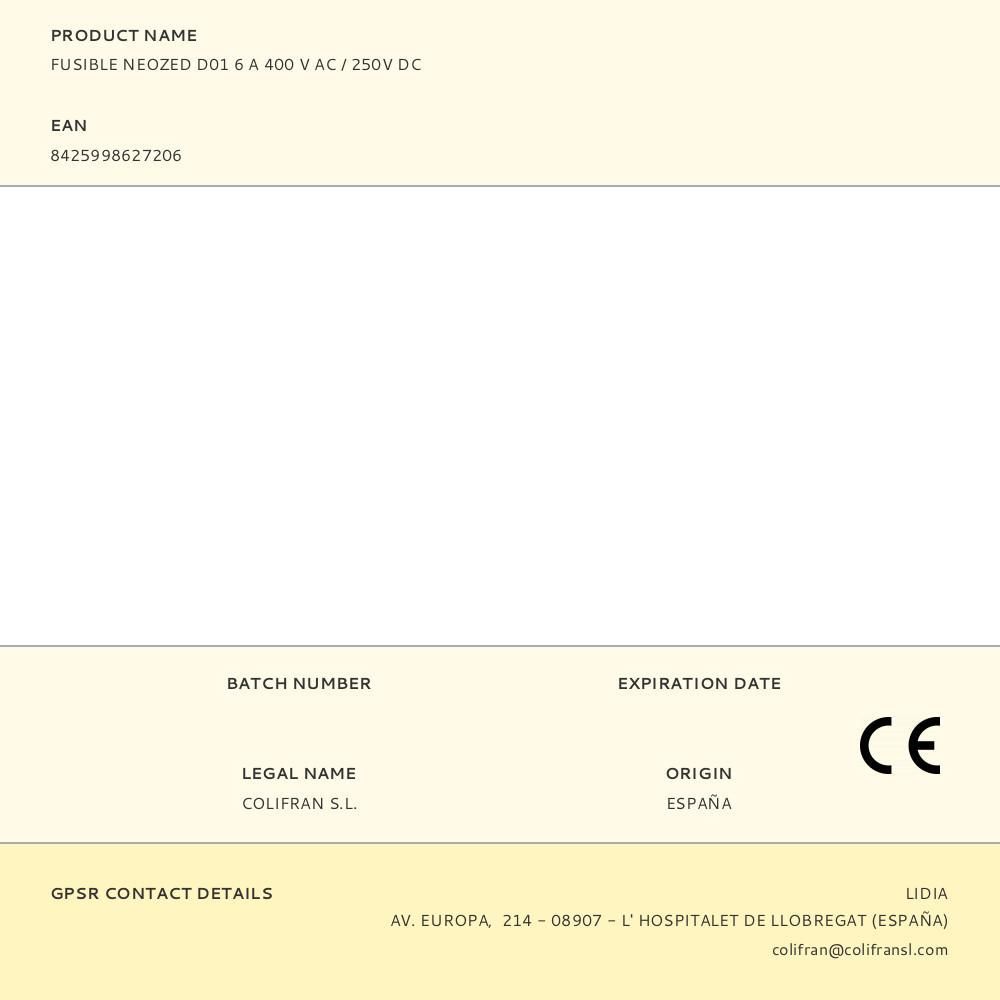 Fusible Neozed D01 6A 400V Ac/250V Dc