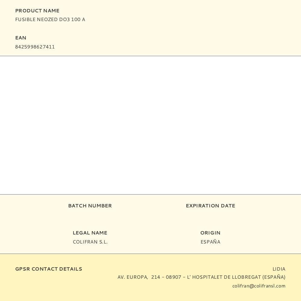 Color , Blanco , Material , Cer u00e1mica , Medida , u00d8 22,5 mm , Intensidad , 100 A , Tipo , Fusible neoced , Modelo , D 03 , Tensi u00f3n , 400 V CA 250 V CC