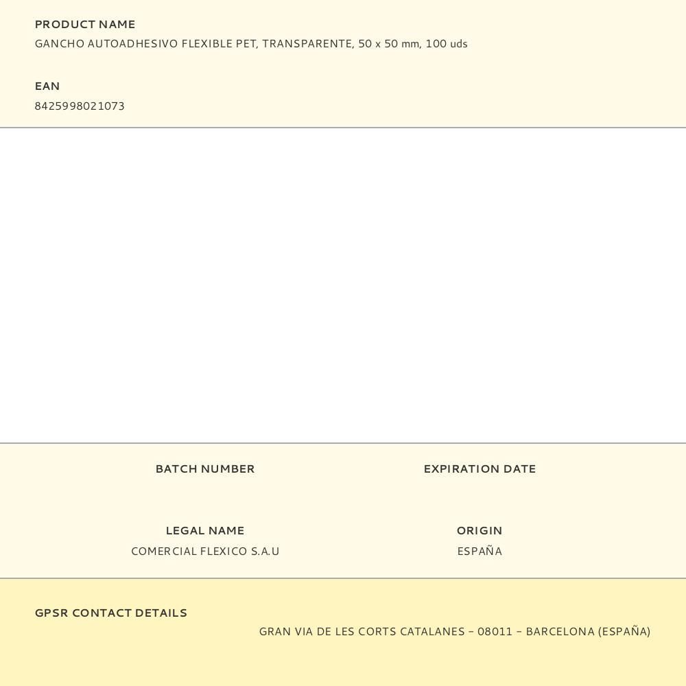 Gancho Autoadhesivo Flexible Pet, Transparente, 50 X 50 Mm, 100 Uds