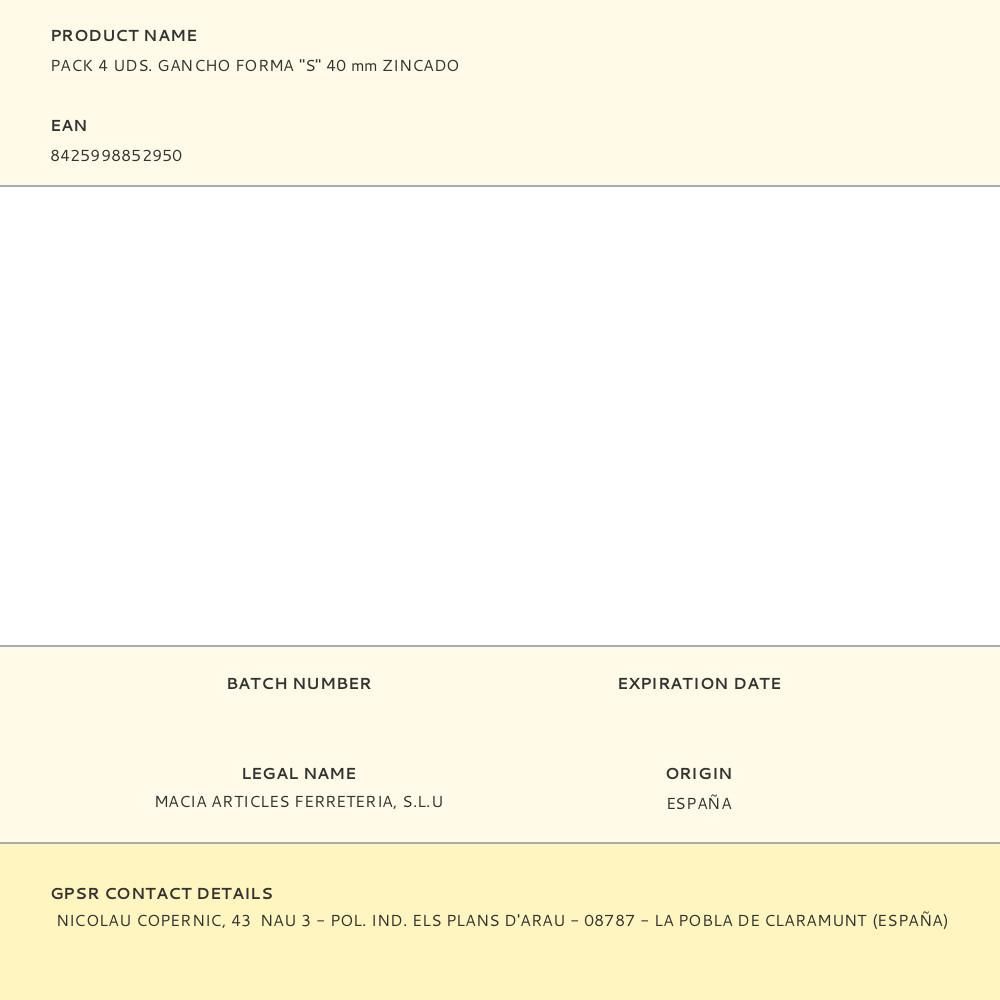 Gancho En Forma De S 40 Mm Zincado, 4 Uds