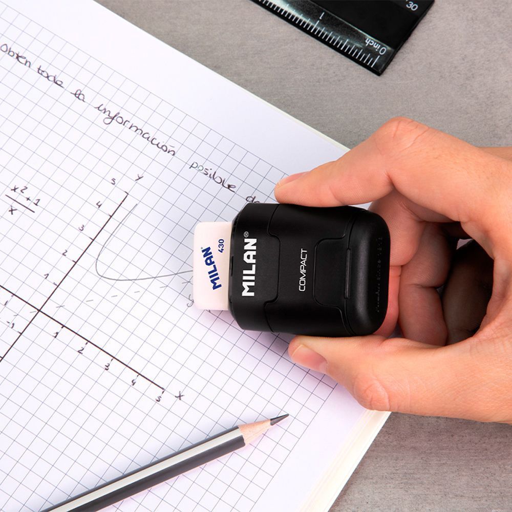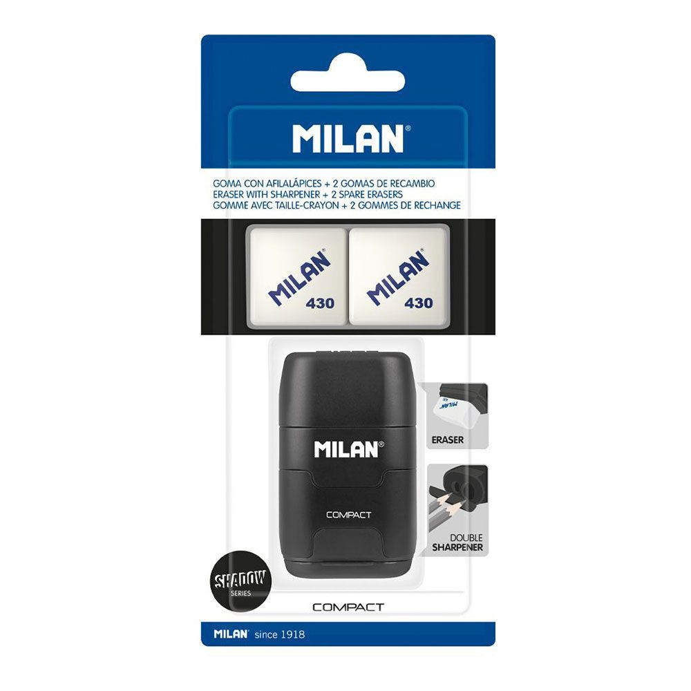 Combinación De Goma De Borrar Y Sacapuntas Doble (Estándar Y Maxi) Con Depósito. Diseño Compact Serie Especial Shadow, Color Negro. Goma Cuadrada De Caucho Sintético Tipo 'Miga De Pan'. El Sacapuntas Dispone De Una Cuchilla De Acero Afilada Y Resistente, Ideal Para Todo Tipo De Lápices. Sacapuntas Con Cuchilla De Seguridad: Este Sistema Evita Que Se Pueda Separar La Hoja Del Cuerpo Del Sacapuntas. Diseño Original Creado Por El Departamento De I+D De Milan. Incluye 2 Gomas De Borrar De Recambio (Modelo 430). Las Gomas De Borrar Milan Están Fabricadas En España Desde 1918.