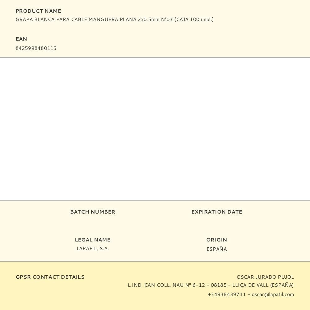 Grapa Para Cable Manguera Plana 2 X 0,5 Mm N°03, Blanca, Caja 100 Uds