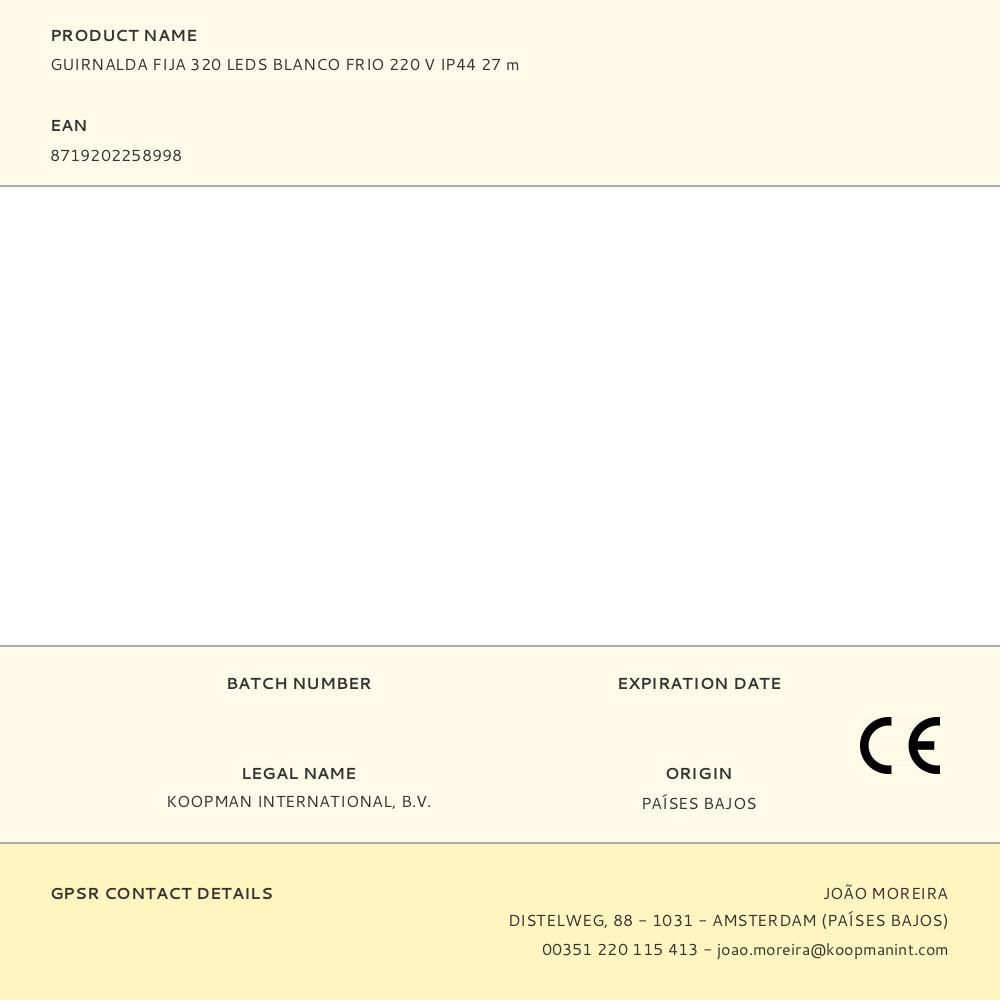 Guirnalda Fija 320 Leds Luz Fría, 220 - 240 V 50/60 Hz, Exterior Ip44, Cable Verde, Distancia Entre Bombillas 7,5 Cm, Distancia Entre La Primera Bombilla Y La Última 24 M, Cable Alimentación 3 M, Largo Total: 27 M