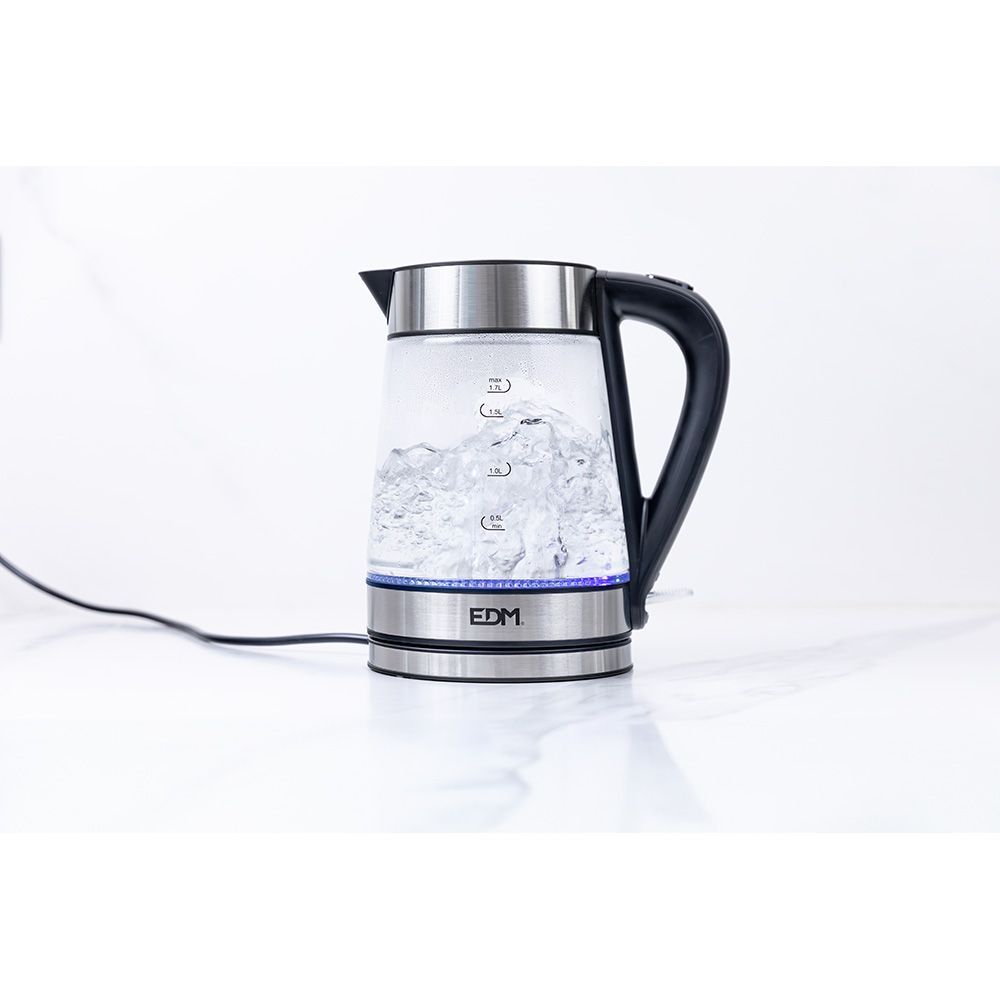 Hervidor De Agua De Cristal + Acero Inoxidable 1,7 Litros 1850 - 2200W Edm. Apagado Automático. Protección Contra Uso En Vacío. Interruptor De Encendido/Apagado Con Luz Led. Dimensiones: Ø17X22X24,5Cm (Diámetro/Ancho/Alto)