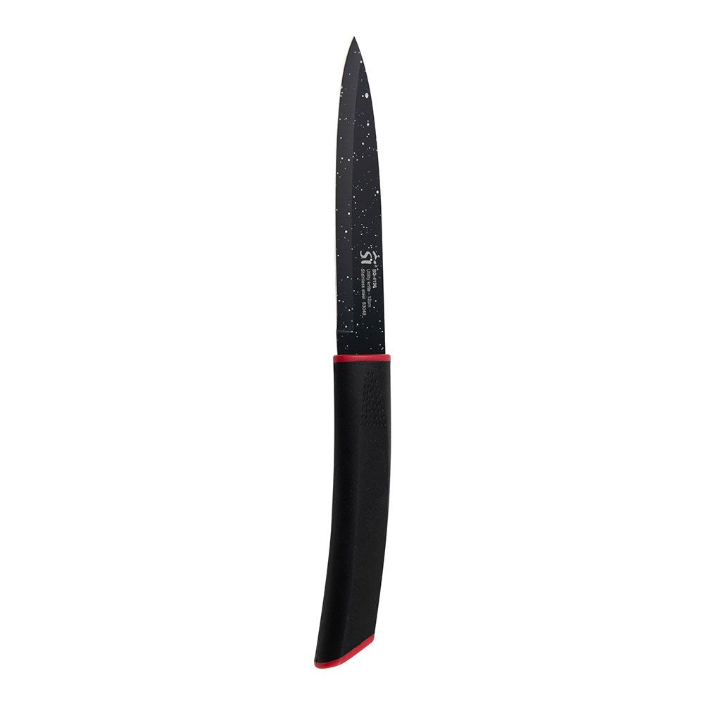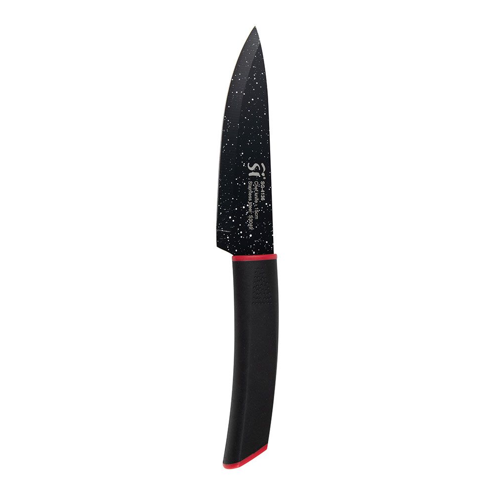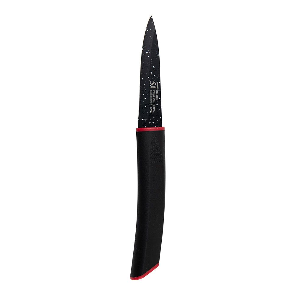 Juego De 3 Cuchillos Acero Inoxidable Con Revestimiento De Mármol 1 Cuchillo De Chef 29,5 X 4,5 X 2,6 Cm 1 Cuchillo Multiusos 25 X 2,5 X 2 Cm. 1 Cuchillo De Pelar 21,5 X 2,5 X 2,0 Cm Mango Negro Inserto De Color Rojo