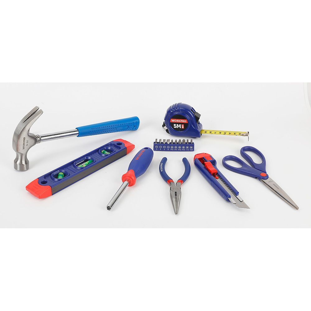Juego De Herramientas Compuesto Por 17 Piezas: Tijera 200 Mm, Cúter 18 Mm, Cinta Métrica De 5 M, Alicate De Punta Larga 160 Mm, Nivel Con 3 Burbujas Y Base Magnética 225 Mm, Martillo De Garra 340 G Y 10 Puntas