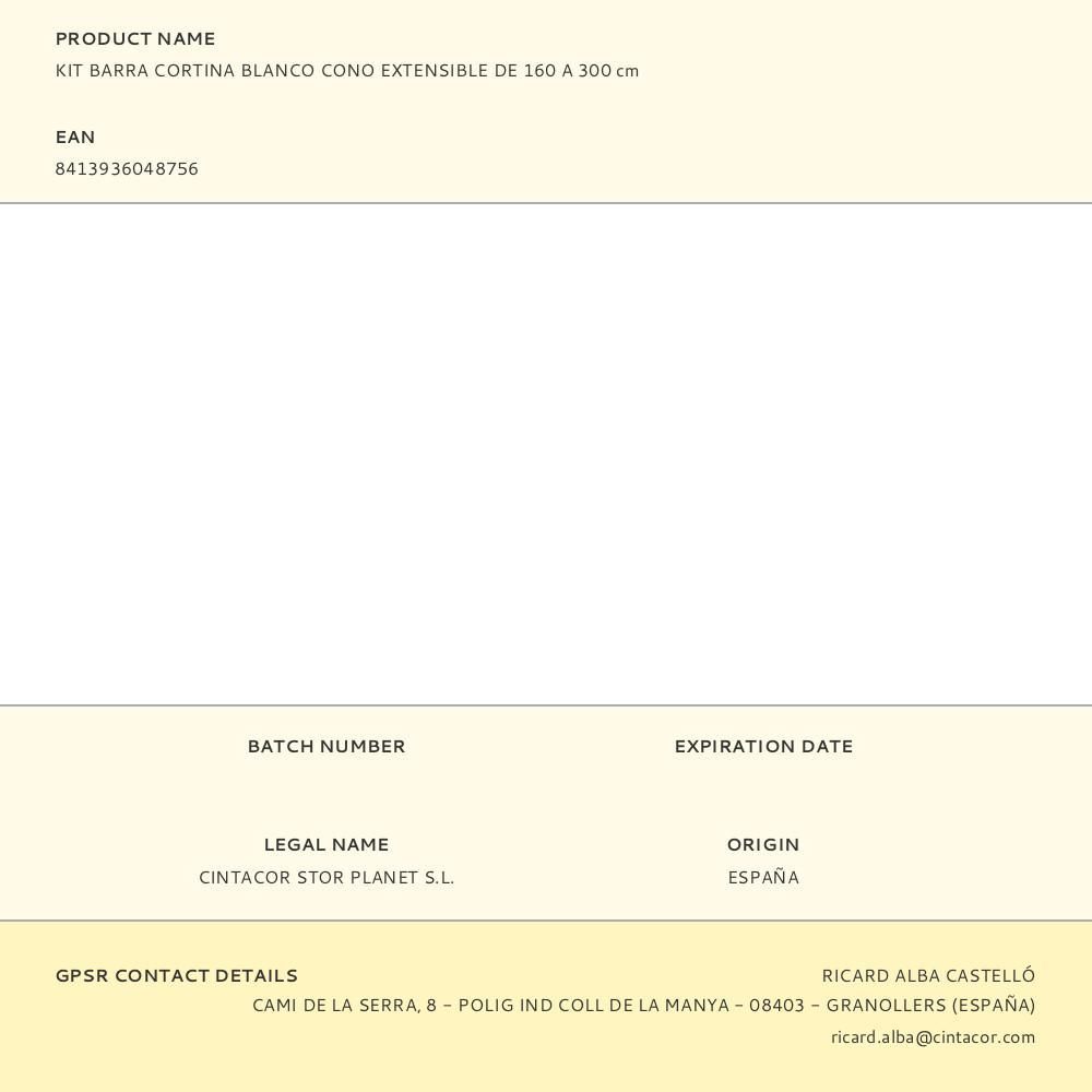 Kit Barra Cortina Cono Extensible De 160 A 300Cm Blanco. Barras Completas En Formato De Kitø16-19Cm . Contienen Los Componentes Necesarios Para La Instalación : Dos Barras, 2 Soportes Extensibles Con Tacos Y Tornillos Y 2 Terminales (Sin Anillas). Acabado Satinado. Instalación En Pared. Mantenimiento: Limpieza Con Un Paño Seco.