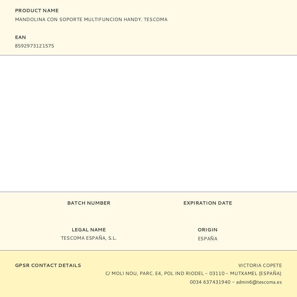 Mandolina Con Soporte Multifuncion Handy. Mandolina Con Soporte Multifunción Para Cortar Cómodamente Y De Forma Segura Sin Riesgo De Lesiones. Afilada Hoja De Acero Inoxidable Con Grosor De Corte Ajustable De 1, 2 Y 3 Mm. Apto Para Lavavajillas. Garantía De 3 Años