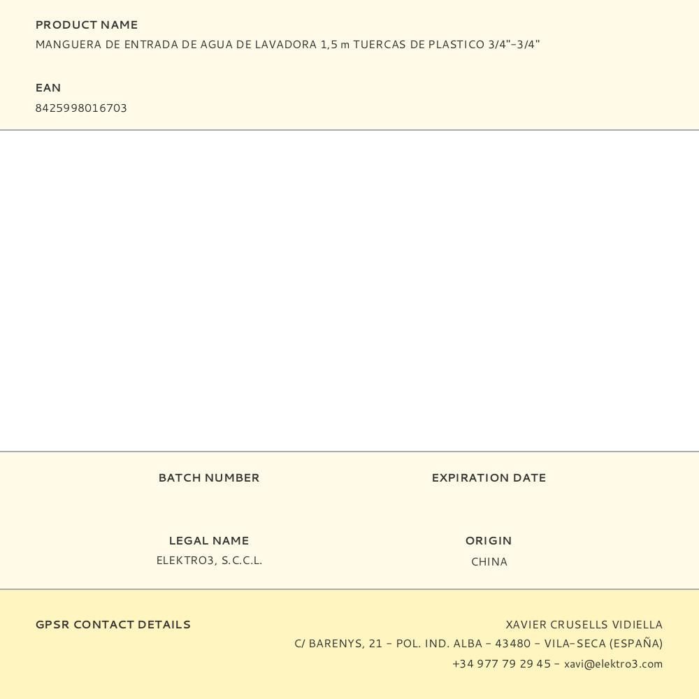 Manguera De Entrada De Agua De Lavadora 1,5 M Tuercas De Plástico 3/4-3/4 Pulg, Presión Nominal 10 Bares, Presión Máxima 40 Bares
