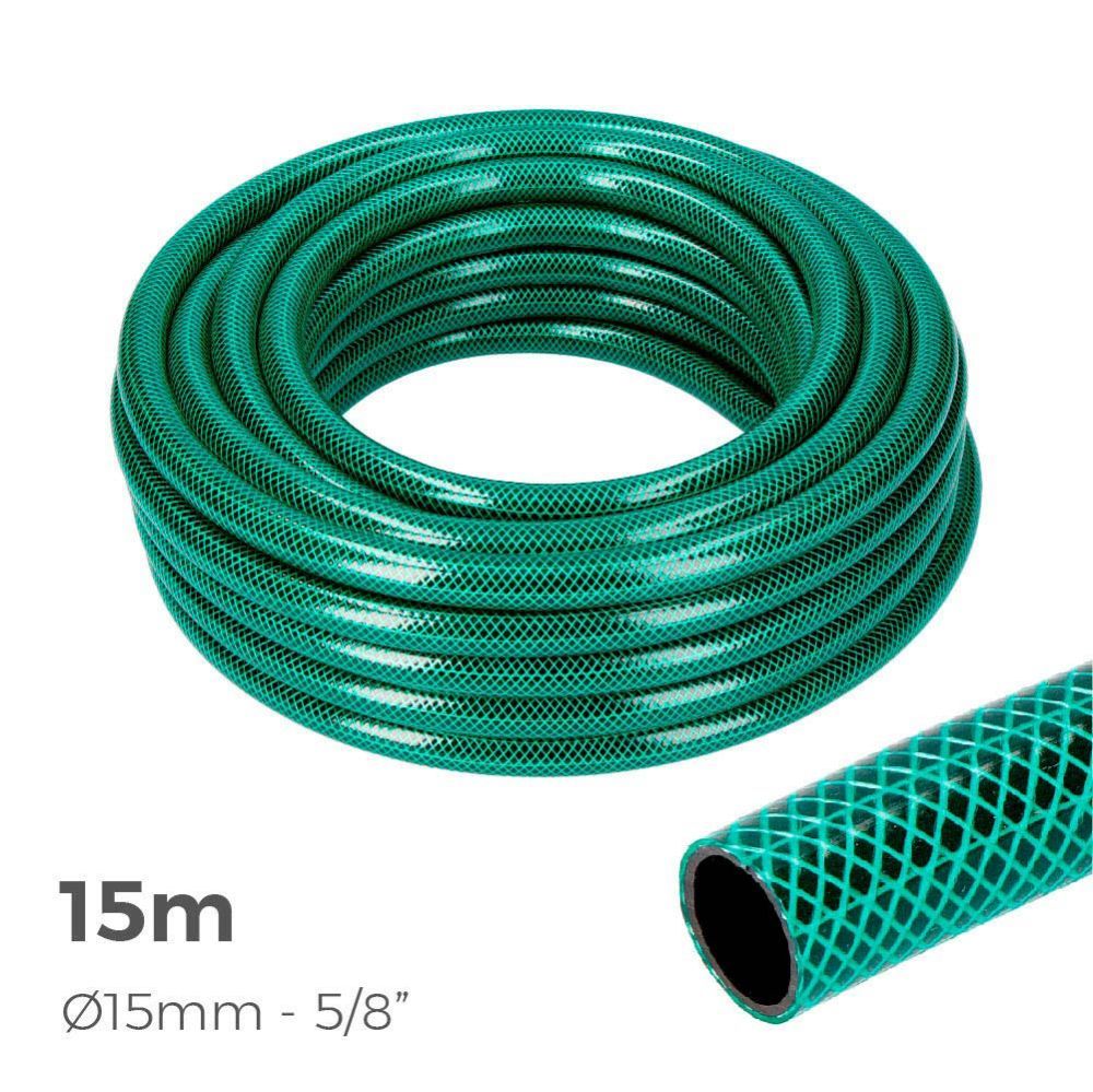 Manguera De Jardín Ø15 Mm, 5/8 Pulg, 15 M, Color Verde, Manguera Flexible Pvc, 3 Capas, Presión Máxima: 20 Bar. Tratamiento Anti-Algas.Temperatura De Uso: -5°/+60°