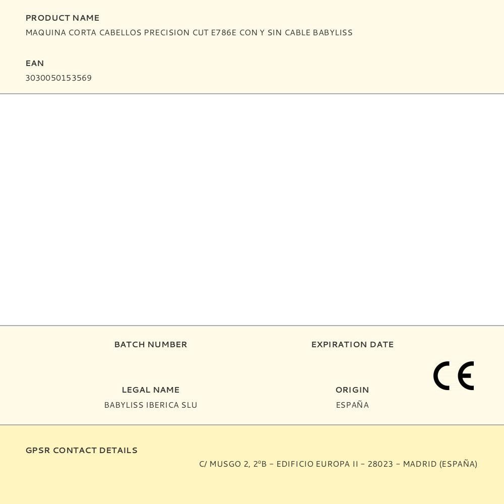 Maquina Corta Cabellos Precision Cut E786E Con Y Sin Cable Babyliss. Cabeza 100% Metálico Con Cuchillas De Acero Inoxidable. Cuchillas De 40Mm. Uso Con Y Sin Cable. 60 Minutos De Autonomía, 8H De Carga. 1 Guia De Corte De Cabello. 13 Longitudes De Corte Desde 0,5Mm Hasta 24Mm, Bolsa De Almacenamiento, Cepillo De Limpieza, Aceite Lubricante. Cuchillas Lavables Bajo El Grifo. Garantía De 3 Años. Servicio Técnico Propio Http://Www.Presat.Es/Talleres/Buscar-Sat