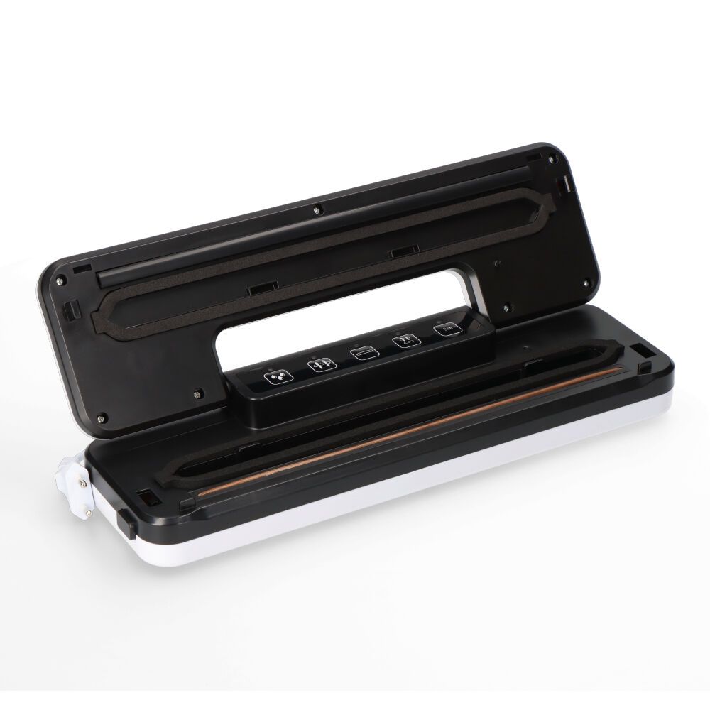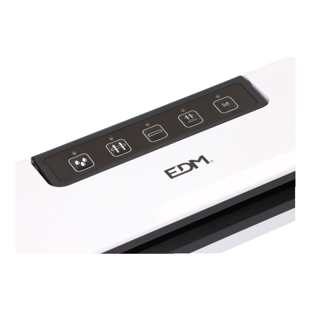 Máquina De Vacio 90W. Potencia De Vacio 35-55Kpa, Ancho De Sellado 28Cm, Indicador Luminoso. Con 5 Funciones: Modo Húmedo, Para Alimentos Humedos, Contenedor De Vacio, Solo Sello, Aspirar Y Sellar, Y Blandos, Para Alimentos Sensibles A La Presión. Contiene 1 Bobina De Bolsas Y Tubo De Aspiración. No Contiene Depósito De Evacuación. Compatible Unicamente Con Bolsas De Vacio Edm (Ref. 07587). Color Blanco Y Negro. Medidas 37,6X11X5,7Cm. 220-240V ~ 50/60Hz