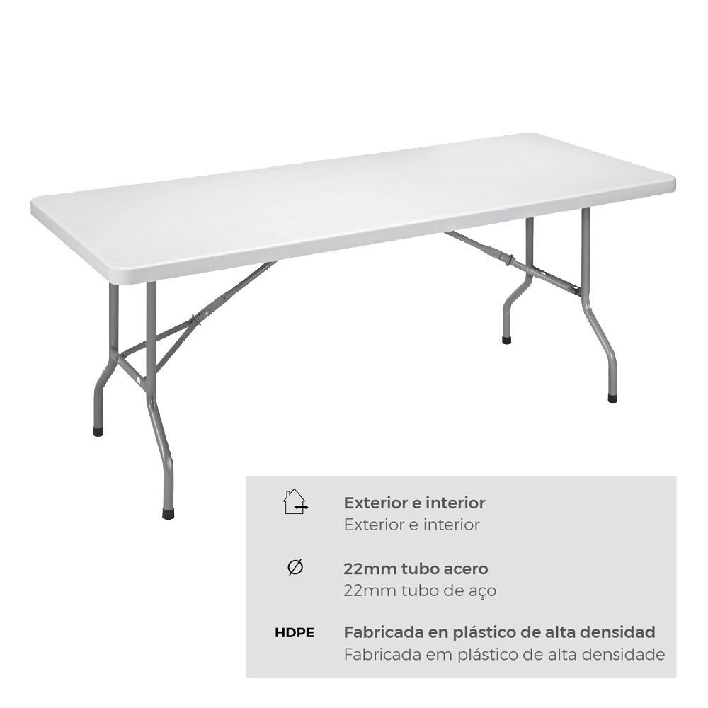 Mesa Plegable Dimensiones Montada: 180 X 74 X 74 Cm (Ancho/Fondo/Alto) Medida Plegada: 95 X 35 X 9 Cm (Ancho/Fondo/Alto). Tubo Ø22 X 1.0Mm. Uso Exterior E Interior, Acero, Fabricado En Plástico De Alta Densidad. No Apta Para Uso Profesional
