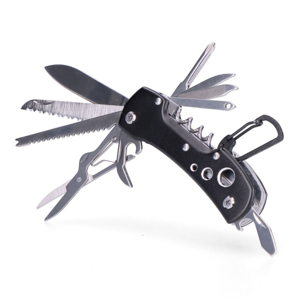 Multiherramienta Modelo Negro, Con Mango De Aluminio, Hoja De Acero Inoxidable 420, Incluye Estuche De Nylon Y Enganche Para Cinturón, Consta De 12 Herramientas: Navaja, Sierra, Limpiador De Escamas, Tijeras, Abrelatas, Abrebotellas, Sacacorchos, Destornillador Philips, Enhebrador, Perforador De Cuero, Lima De Uñas Y Mosquetón, Serie Kilimanjaro