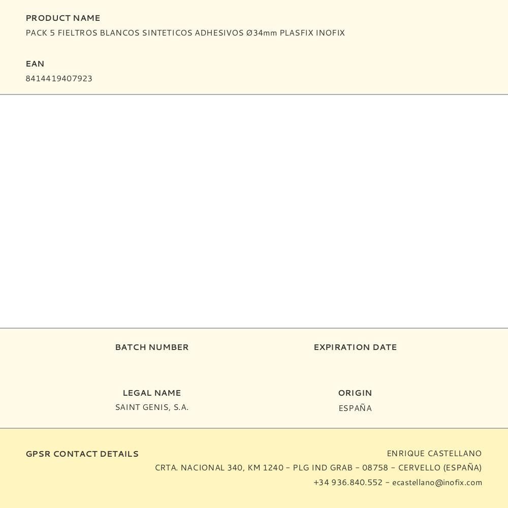 Pack 5 Fieltros Blancos Sinteticos Adhesivos Ø34Mm Plasfix Inofix