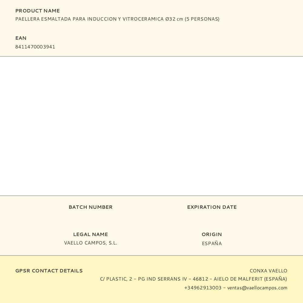 Paellera Esmaltada Ø32Cm (5 Personas) Apta Para Cocinas De Induccion Y Vitroceramica. Fabricacion Nacional. Atención: Requiere Mantenimiento. Debe Ser Almacenado Con Una Cubierta De Aceite. Vaello