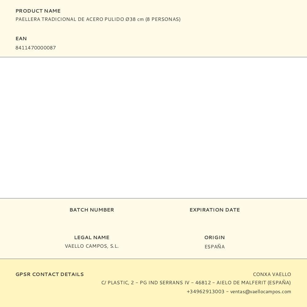 Paellera Tradicional De Acero Pulido Ø38Cm (8 Personas) Apta Para Cocinas De Gas. Fabricacion Nacional. Atención: Requiere Mantenimiento. Debe Ser Almacenado Con Una Cubierta De Aceite. Vaello