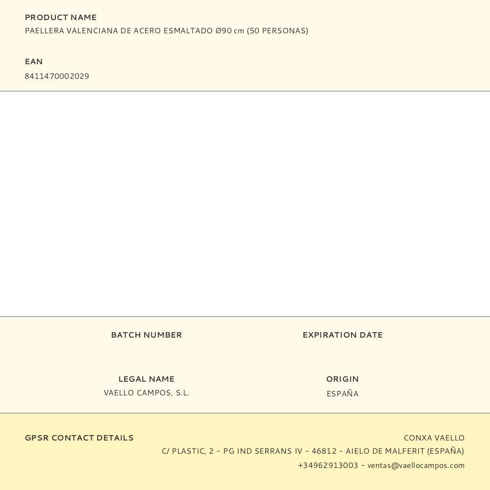 Paellera Valenciana De Acero Esmaltado Ø90Cm (50 Personas) Vaello. 4 Asas. 50 Comensales. Producto Fabricado En Acero Laminado En Frio Y Recubierto Con Una Capa De Esmalte Antiácido. Limpieza Y Mantenimiento Más Sencillos.