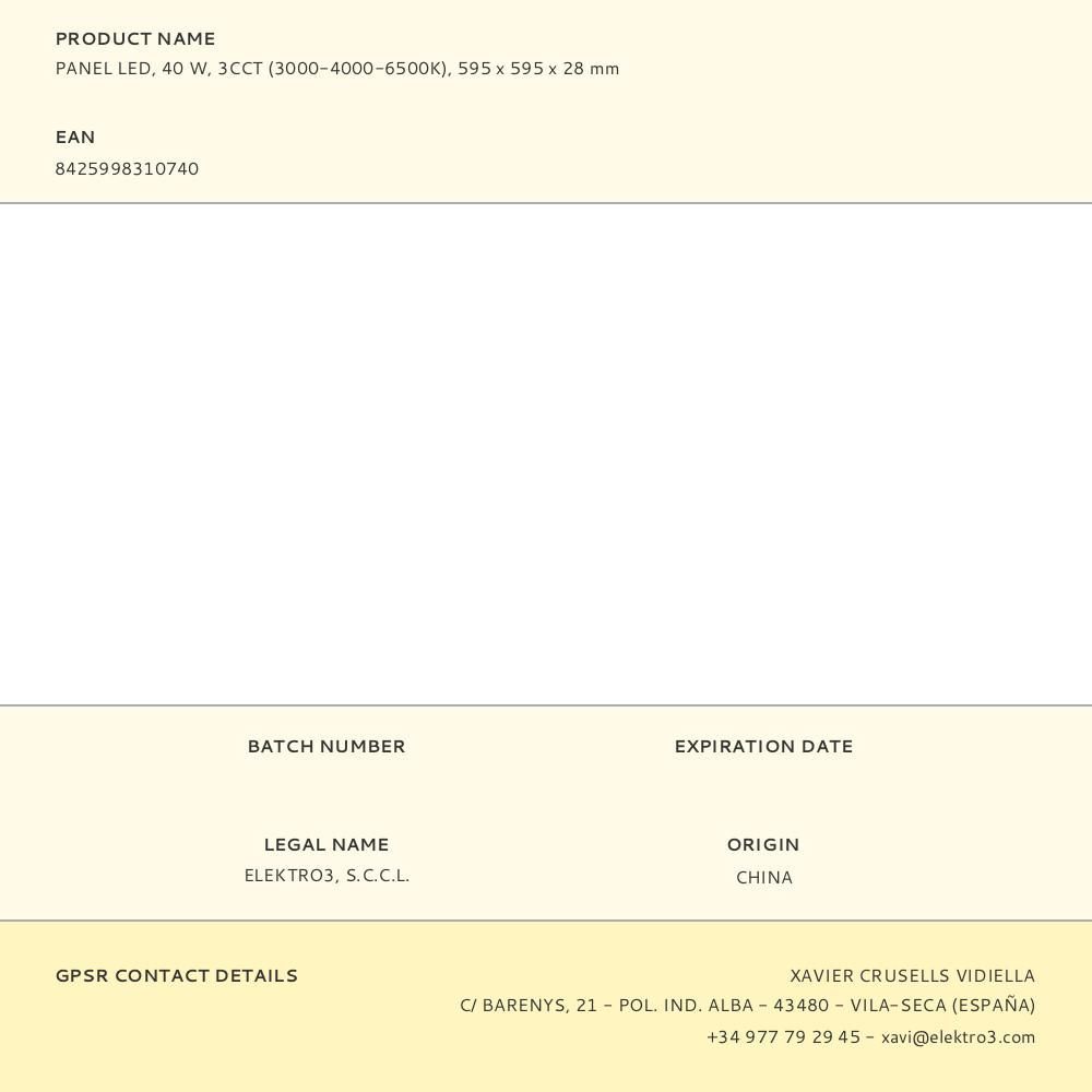 Panel Led, 40 W, 3Cct (3000-4000-6500 K), 4800 Lm, Tipo De Flujo Luminoso 360°, Ángulo De Apertura: 120°, 220-240 V~50 Hz, Ip20, Ra80, Clase Energética: E, Marco De Aluminio Color Blanco, Temperatura De Luz Variable Mediante Selector, Dimensiones: 595 X 595 X 28 Mm