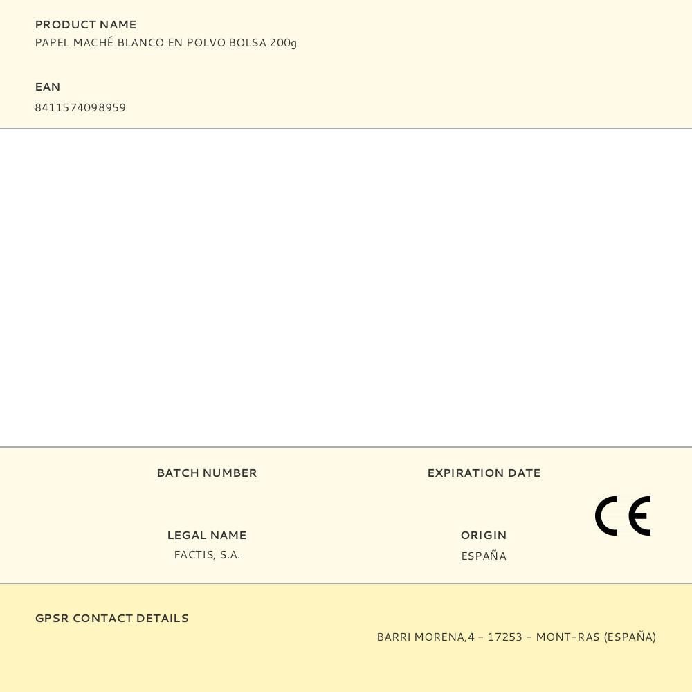 Bolsa 200G Papel Maché Blanco En Polvo Milan. Papel Maché En Polvo, Muy Suave Y De Color Blanco. Para Formar Pasta. Secado Al Aire (Tiempo De Secado Aproximado: A Partir De 48H Dependiendo Del Grosor Y Las Condiciones Ambientales). Instrucciones De Uso: Mezclar 3 Partes De Polvo Con 1 De Agua Hasta Que Quede Una Pasta Homogénea. Aplicar La Pasta Sobre La Superficie Con Un Grosor Aproximado De 2 A 3Mm Y Cubrir De Forma Uniforme Sin Dejar Huecos Ni Burbujas. Una Vez Seco, Se Puede Pintar Con Témpera O Pintura Acrílica Y Decorar Con Otros Elementos Como Cartulinas O Adhesivos.