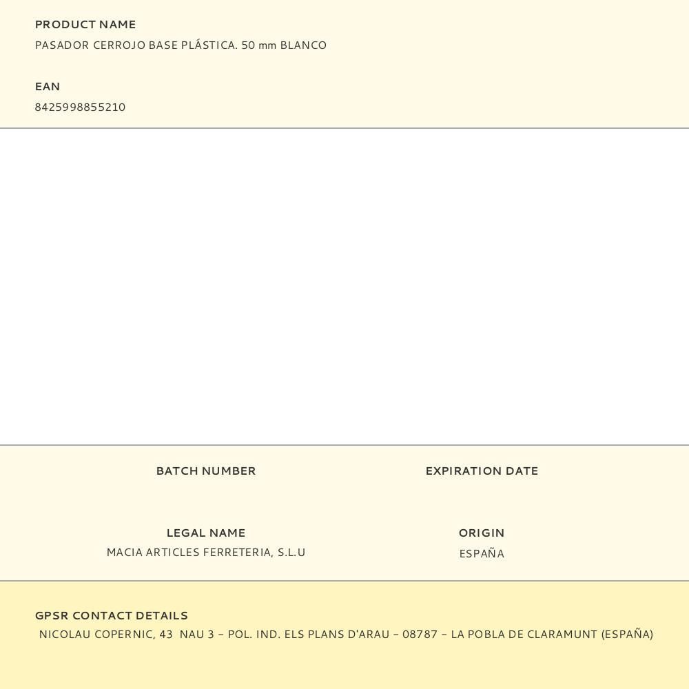 Pasador Cerrojo Base Plástica. 50 Mm Blanco