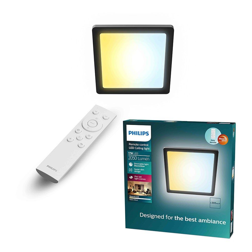 Plafón Cuadrado Negro, Modelo Valen, 17 W, 2050 Lm, Tipo De Flujo Luminoso 360°, Luz Regulable 2200 - 6500 K, Irc 80, Eficacia Lumínica 120 Lm/W, Led Integrado. Tensión 220 - 240 V ~50/60 Hz, Grado De Protección Ip20, Diseño Superdelgado, Con Escenas De Luz Predeterminadas, Material Plástico. Incluye Mando A Distancia (Pilas Incluidas), Vida Estimada 20.000 H, 395 × 37 × 395 Mm