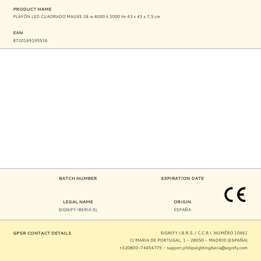 Plafón Cuadrado Mauve, 24 W, 4000 K, 3000 Lm, Luz Día. Flujo Luminoso: 360°, 220 - 240 V ~ 50 - 60 Hz. Ip20. Vida Estimada: 15.000 H, No Dimmable. Distribución De La Luz Uniforme (Lente Con Microestructura Piramidal). Dimensiones: 43 X 43 X 7,5 Cm