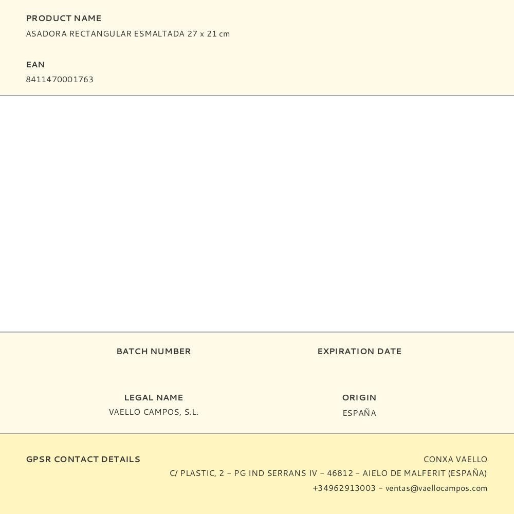 Asadora Rectangular Esmaltada 27X21Cm. Producto Fabricado En Acero Laminado En Frío Y Recubierto Con Una Capa De Esmalte Antiácido. Las Asadoras De Acero Esmaltado Se Utilizan Para Asar Todo Tipo De Carnes, Pescados Y Verduras. Apta Para Fuegos De Llama. Vaello