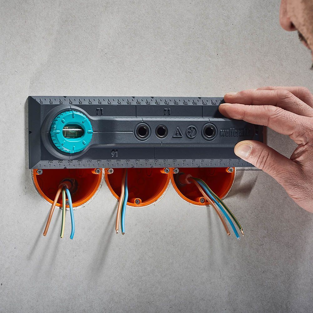 Plantilla De Perforación Electricidad, Para Medidas De 71 Y 91Mm.Plantilla Para Marcar, Alinear Y Taladrar Para La Instalación De Interruptores Y Cajas De Enchufe En Paredes De Ladrillo.Nivel De Burbuja Con Giro De 90° Para Una Alineación Horizontal Y Vertical De La Plantilla De Marcado Preciso De La Posición Del Taladro Y Para Alinear Las Cajas De Instalación Y Los Insertos. Marcas De 71 Y 91Mm Para Transferir Cómodamente Las Distancias Correctas Entre Dos Cajas De Instalación, Así Como Cajas De Enchufe Y Cajas De Tv O Red. Manual De Instrucciones Paso A Paso Con Ilustraciones Para El Uso Correcto De La Plantilla Para Una Instalación Cómoda Y Segura