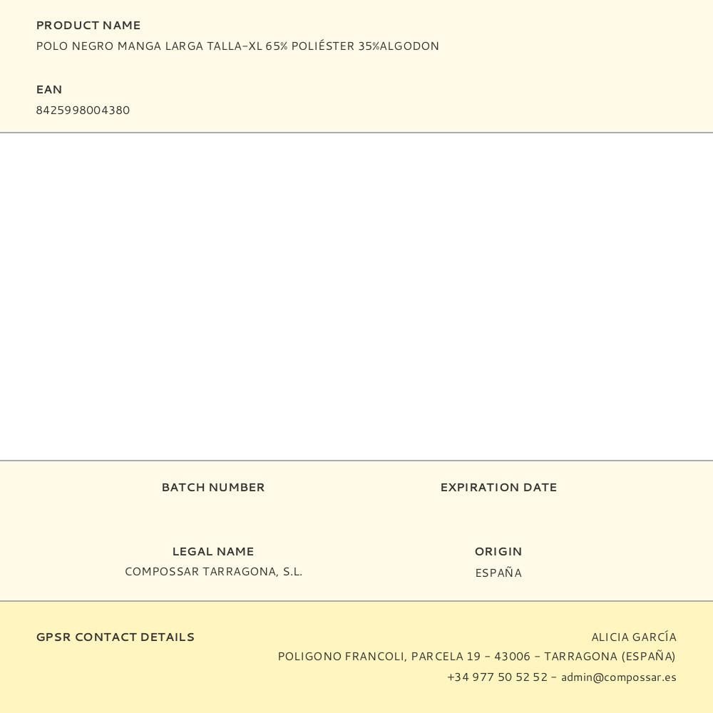 Polo Negro Manga Larga Talla-Xl 65% Poliéster 35%Algodon