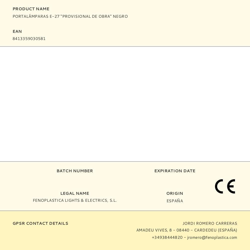 Portalámparas Negro E-27 Provisional De Obra. 4A 250 V, Máximo 60 W. Cuerpo De Una Pieza, Conexión Sin Tornillos, Para Cable De Sección De 0,5 A 2,5 Mm². Ø38 X 62 Mm