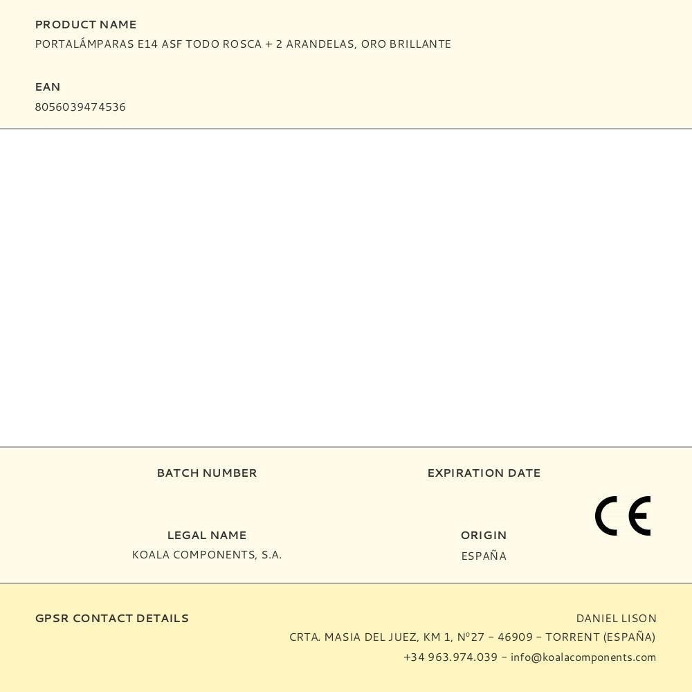 Portalámparas E14 Asf Todo Rosca + 2 Arandelas, Oro Brillante