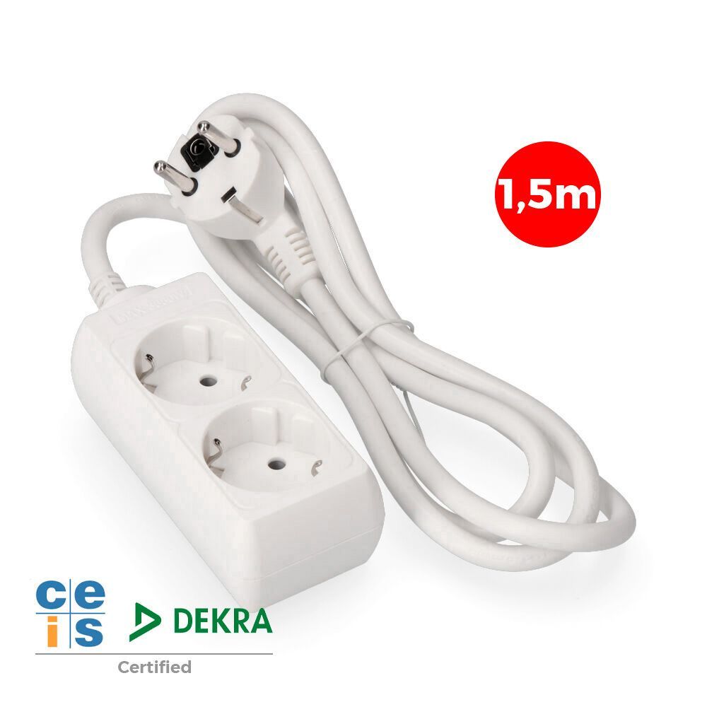 Base Múltiple, 2 Tomas Schuko 2P+T, 1,5M De Cable H05Vv-F 3G1,5 Mm² 16A 250V~ 3680 W, Blanca