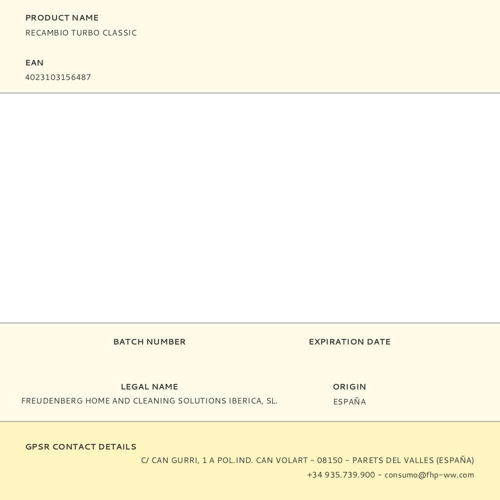 Recambio Turbo Classic Easywring Classic. Recambio Fregona 100% Microfibras Especial Para El Sistema De Limpieza Vileda Turbo