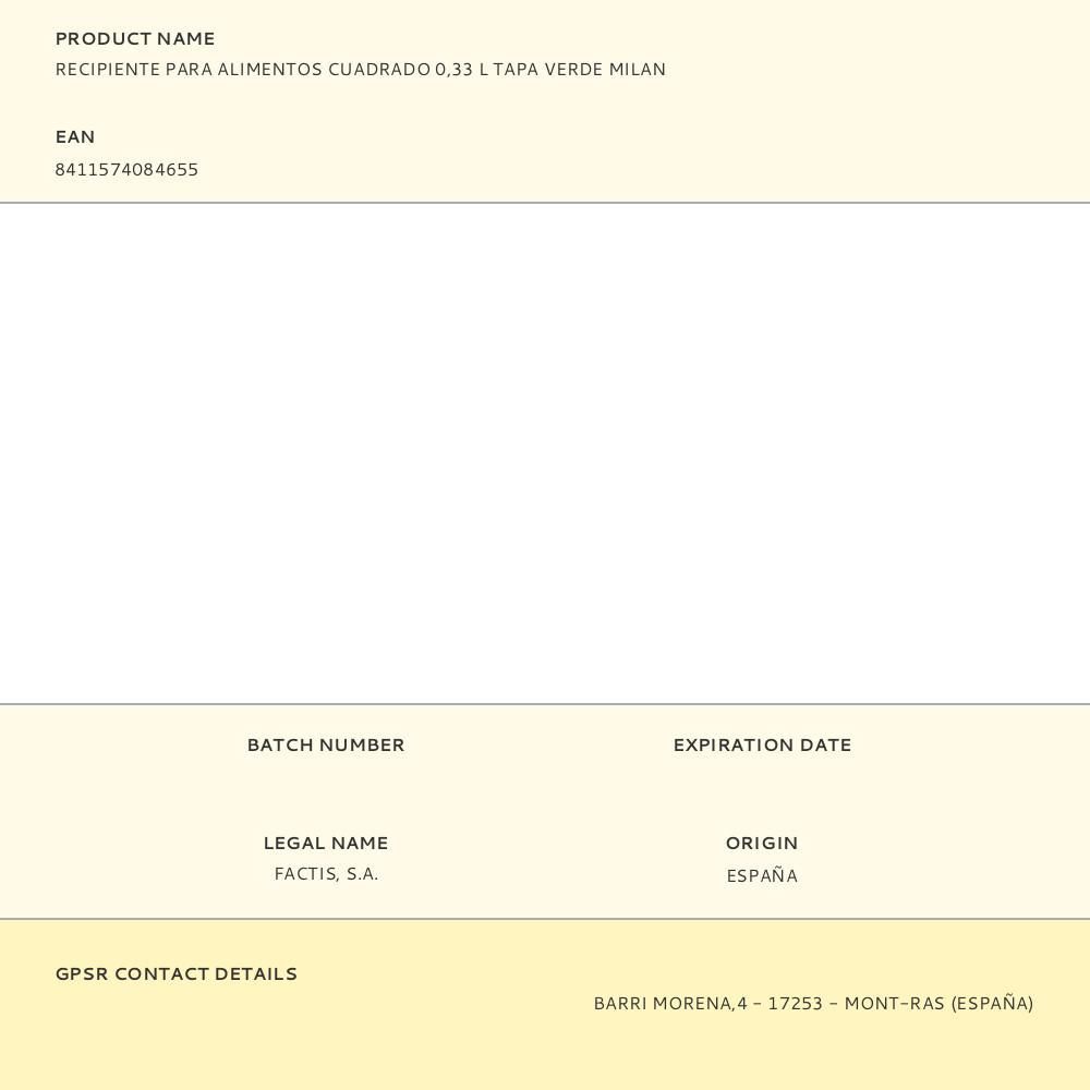 Recipiente Para Alimentos Cuadrado 0,33 L Tapa Verde. Recipiente Para Alimentos Cuadrado Y Tapa Verde. Apto Para Calentar En Microondas (Máx. 70°C) Con La Tapa Abierta Para Liberar El Vapor.Apto Para Congelador (Hasta -20°C). Apto Para Lavar En El Lavavajillas (Máx. 70°C). Las Tapas Y Los Recipientes Son Fácilmente Apilables Entre Sí. Acabado Exterior Mate, Para Facilitar La Sujeción. Interior Con Esquinas Redondeadas Y Acabado Brillante Para Favorecer Su Limpieza. Material: Plástico Libre De Bisfenol A (Bpa Free). Medidas: 12 X 10 X 7 Cm. Capacidad 0,33 L