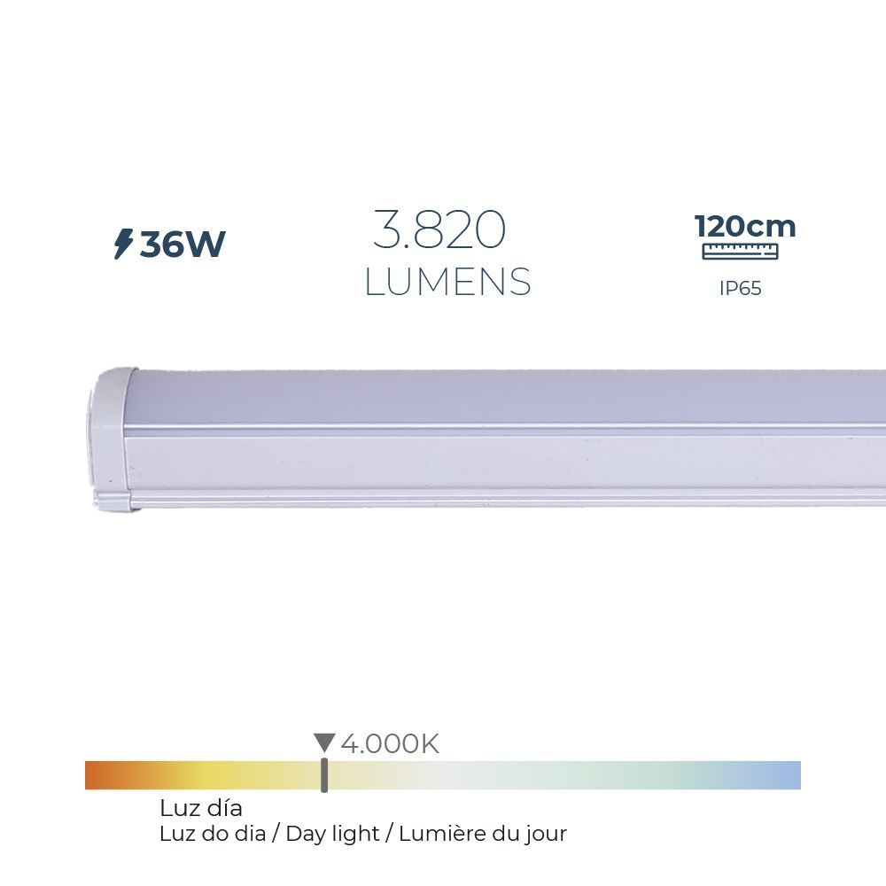 Regleta Electrónica Led 36 W 4.000 K Luz Día Ip65 192 Leds, 3.820 Lm. No Regulable, Encendido Rápido, Sin Parpadeo, Angulo De Luz 110°. No Interconectables. Ra>80 115Ma 220.240V-50Hz. Medidas: 120 X 4,6 X 5,1 Cm. 25000 H