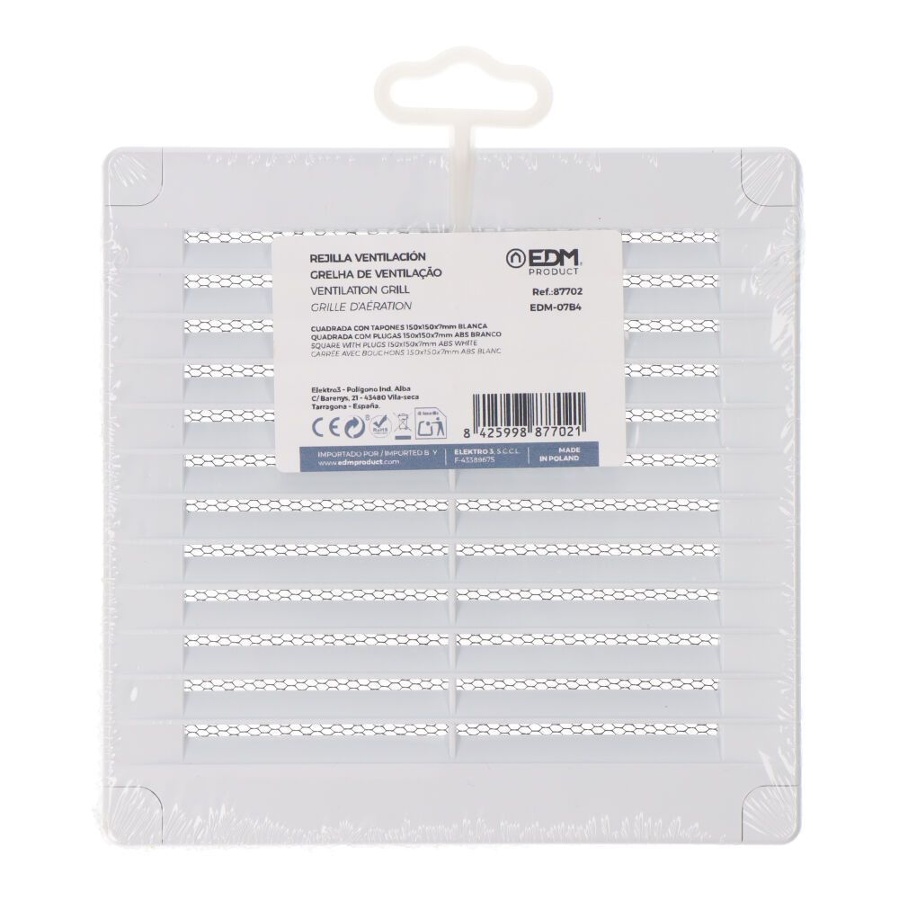 Rejilla Ventilación Cuadrada Con Tapones Y Mosquitera 150X150X7Mm Abs Blanca