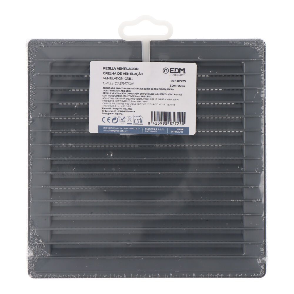 Rejilla Ventilación Cuadrada Empotrable Ajustable Ø 80-150 Con Mosquitera 170X170X11,5Mm Abs Gris