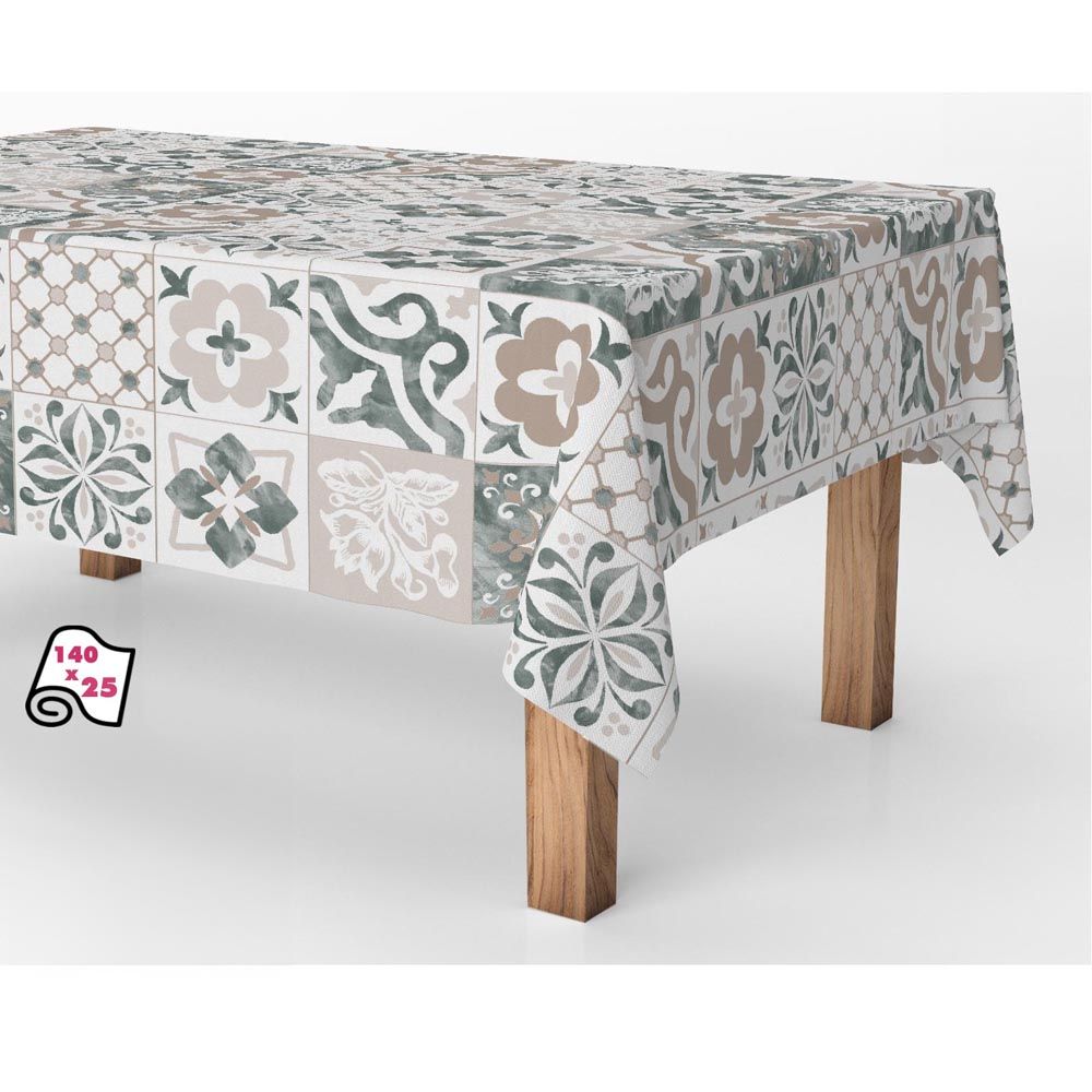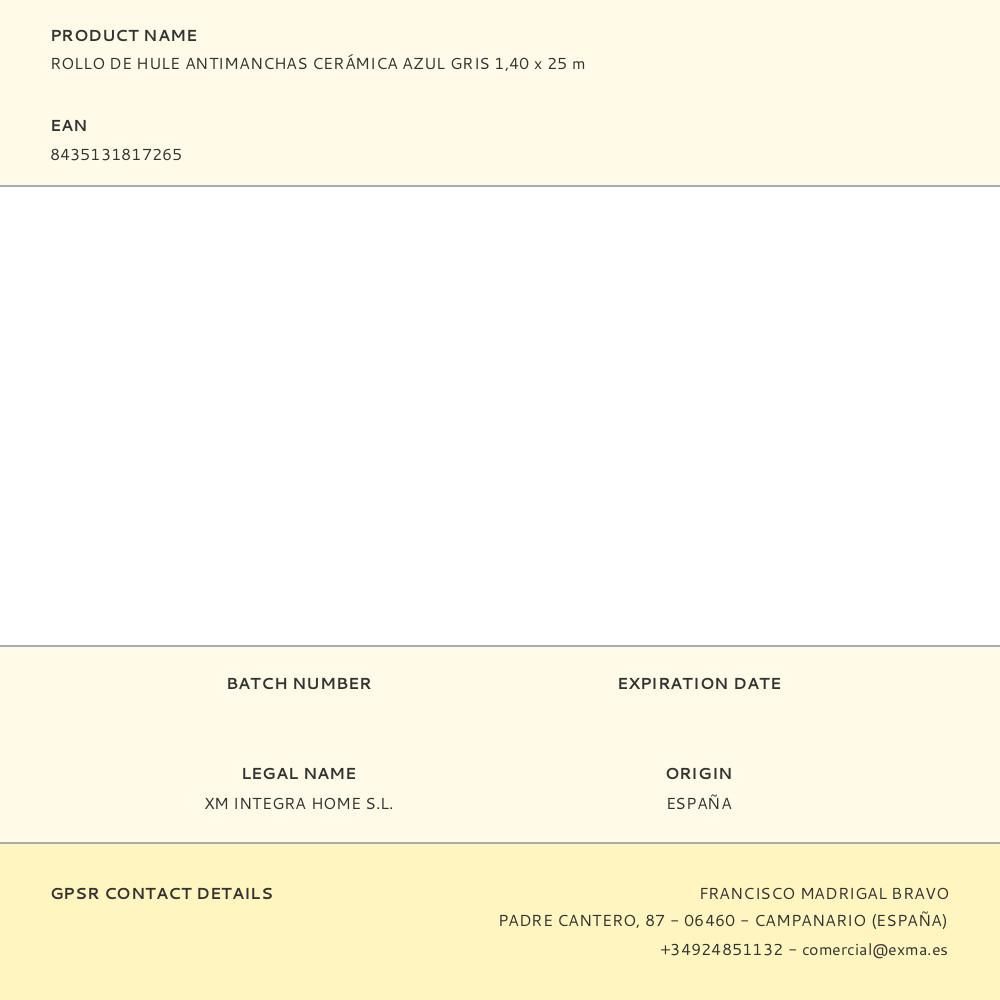 Rollo De Hule Antimanchas Azul-Gris. Mantelería De Tejido Antimanchas Gama Básica. Composición 70% Poliéster, 30% Algodón. No Lavable, Limpieza Con Paño Húmedo En Superficie. Medidas: 1,40 X 25 M