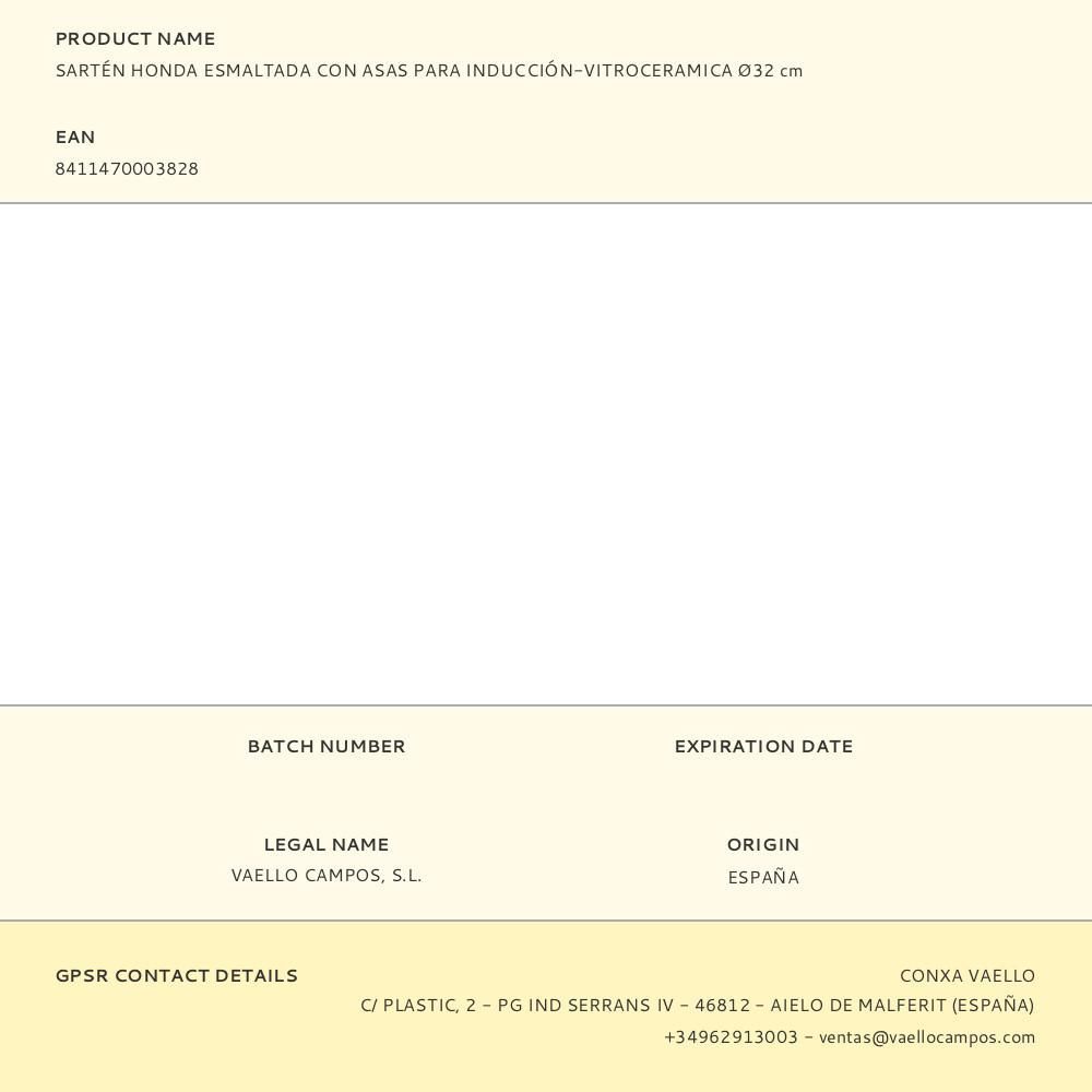 Sartén Honda Esmaltada Con Asas Para Inducción-Vitroceramica Ø32Cm. Vaello. Apta Para Fuegos De Llama, Eléctrico, Vitrocerámica, Inducción Y Horno.
