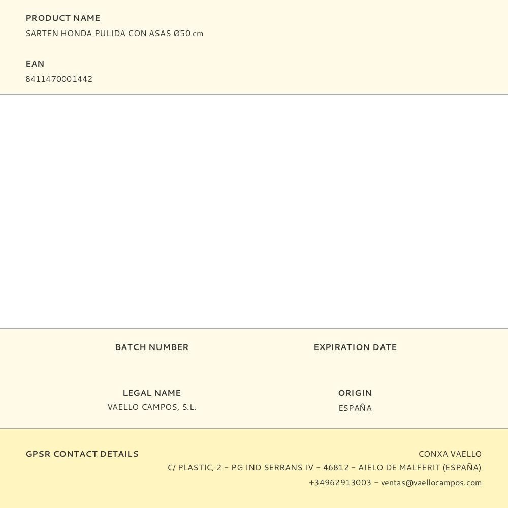 Sartén Honda Pulida Con Asas Ø50Cm. Producto Fabricado En Acero Laminado En Frío. Indicado Para Fuego En Llama. Ideal Para Guisar Arroces Y Calderetas. De 25 A 30 Comensales. Vaello