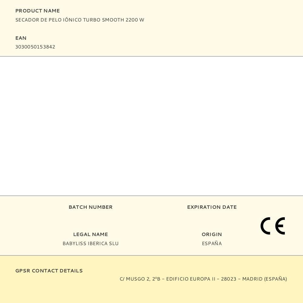 Secador Iónico Turbo Smooth 2200W Babyliss. Velocidad Del Aire 91Km/H, Tres Ajustes De Temperatura, Ajuste De Aire Frio, Dos Ajustes De Velocidad, Iónico: Neutraliza Electricidad Estática, Peso 409G, Boquilla Concentradora Estrecha, Difusor, Filtro Trasero Desmontable, Cable Profesional De 1,95M. Garantía De 3 Años. Servicio Técnico Propio Http://Www.Presat.Es/Talleres/Buscar-Sat