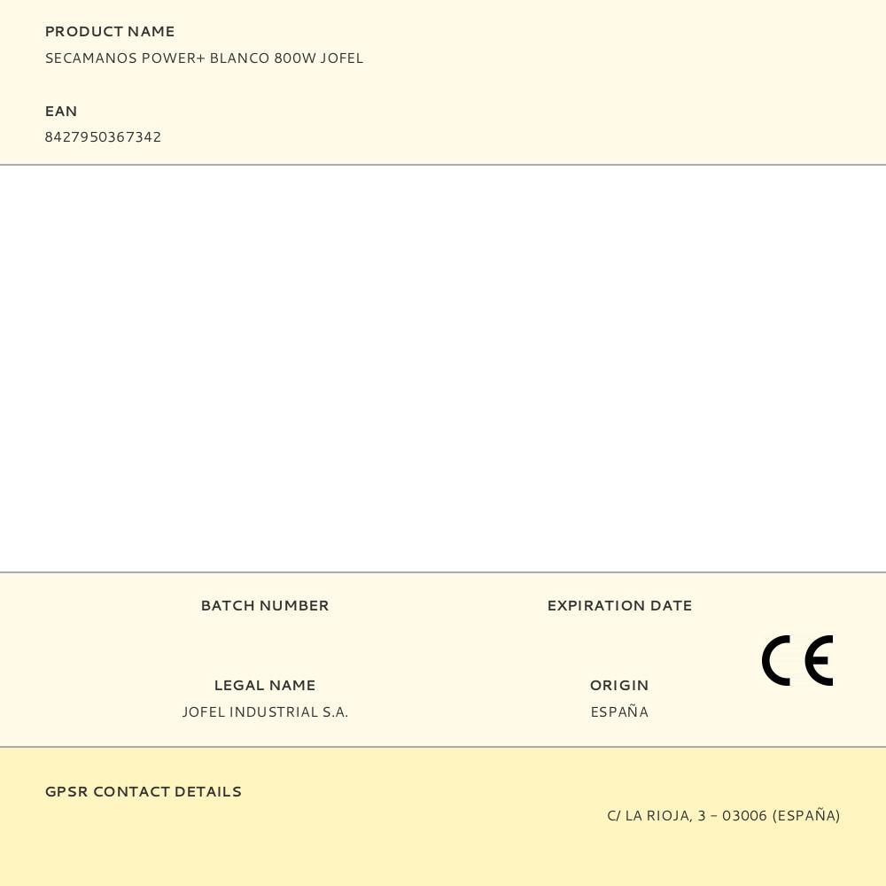 Secamanos Power+ Blanco Jofel. Secamanos Óptico De Altas Prestaciones, Fabricado En Abs De Alta Calidad Y Resistencia, Compacto Y De Reducidas Dimensiones, Secado En Aproximadamente 10", Secado Por Cortina De Aire, Secado Rápido E Higiénico. Antivibración. Filtro Hepa, Motor Universal De Bajo Consumo: 800W. Velocidad De Salida Del Aire: 505Km/H, Incorpora Aislante Acústico, Protección Con Doble Aislamiento Eléctrico (Ip23), Puede Instalarse A 0,60M De Toma De Agua, Certificado En Clase Ii, Parada Automática Por Tiempo. Sistema De Seguridad Con Parada. Módulo Electrónico En Su Base De Fácil Extracción, Conexión A Corriente Por Su Base, Aspiración A Través De Lamas Laterales, Filtro Antipolvo, Filtro Hepa, Baja Rumorosidad (69 Db), Recomendable Para Espacios Reducidos