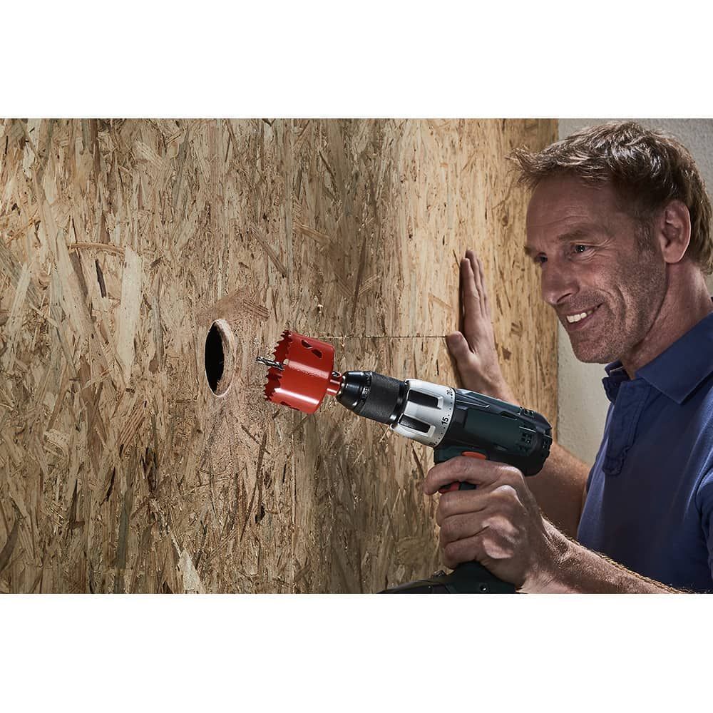 Sierra De Corona Bimetal De Ø127 Mm, Profundidad De Corte 40 Mm, Vástago Hexagonal Ø9,5 Mm, Broca Centradora Hss Ø6 Mm. Dentado Variado Progresivo De Acero De Alta Velocidad (Hss). Para Materiales De Obra En Seco, Madera Y Plásticos