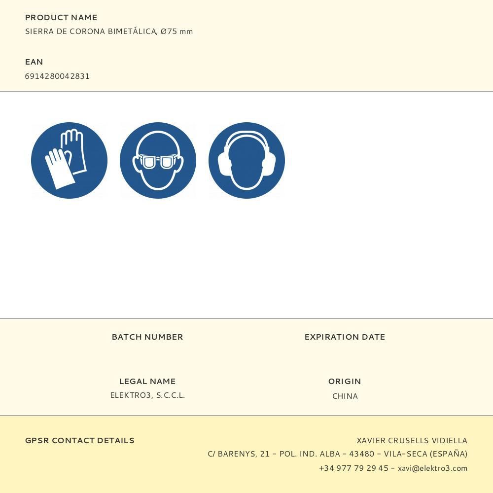 Sierra De Corona Bimetálica, Ø75 Mm, 80 - 120 Rpm, Dientes Fresados M3Hss, Para Metal, Aluminio, Plástico, Pladur, Madera, Etc